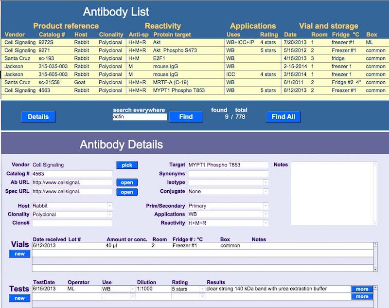 A relational FileMaker Pro database for lab antibodies. Tracks antibody specifications, orders, lot numbers, storage, users, test results (including pictures) and ratings. Written with FileMaker Pro Advanced 11. Use either the database file (http://www.biolog...aseFP7.zip) or the standalone runtime app (download link below). The database is a small file that can be modified with FileMaker Pro 7 or later. The runtime app works without FileMaker, under Windows XP or later. |